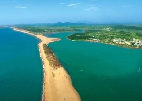 次日一早,我們來到海南風(fēng)水寶地之博鰲,這里因亞洲經(jīng)濟(jì)論壇永久會址而揚名,萬泉河、九曲江、龍滾河三江在此交匯,又有玉帶灘橫臥萬泉河與南海之間,一邊是滾滾浪濤三江入海,一邊是浩瀚南海波濤洶涌,而細(xì)細(xì)長長的玉帶灘千百年來任由河海沖刷靜臥期間,令你不得不贊嘆大自然的鬼斧神工。站在玉帶灘上,面向大海,但見浩淼煙波一望無際,層層白浪撲向腳下,遠(yuǎn)處女媧補(bǔ)天遺落的靈石屹立于南海的波濤之中,任憑風(fēng)吹浪打,它自巋然不動,與玉帶灘向望廝守。一河一海,一淡一咸,一靜一動,佇立于玉帶灘,恍若置身于人間仙境。