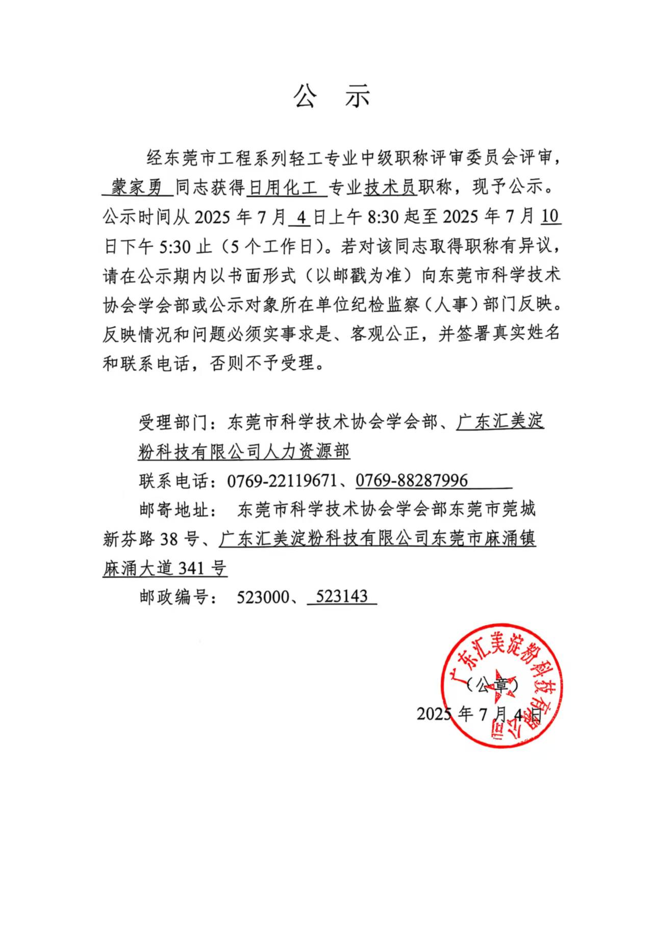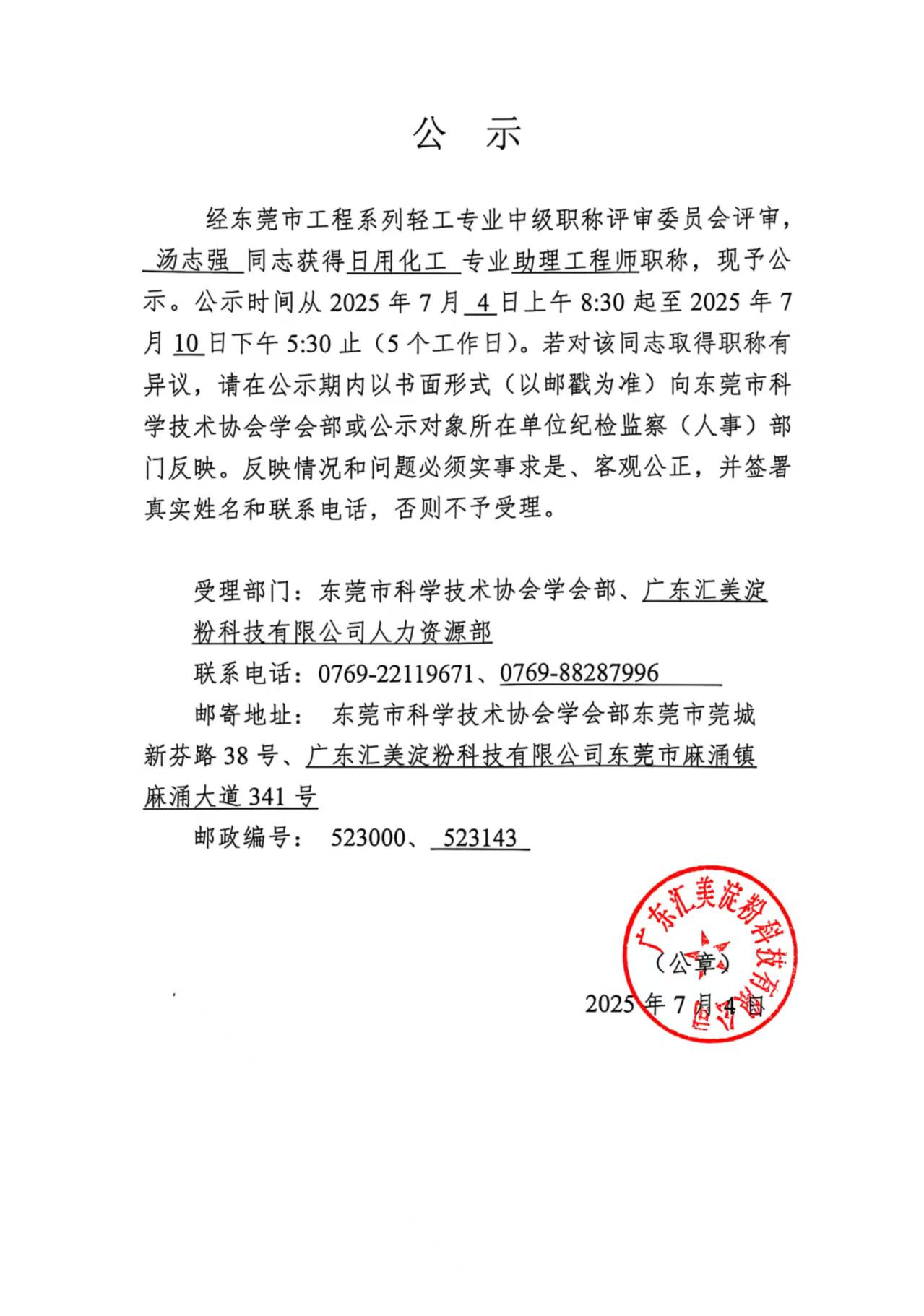我公司湯志強、冉騰飛獲得2024年度日用化工專業(yè)助理工程師資格,蒙家勇、周創(chuàng)新獲得2024年度日用化工專業(yè)技術員資格,根據(jù)東莞市工程系列輕工專業(yè)中級職稱評審委員會要求,現(xiàn)予以公示。